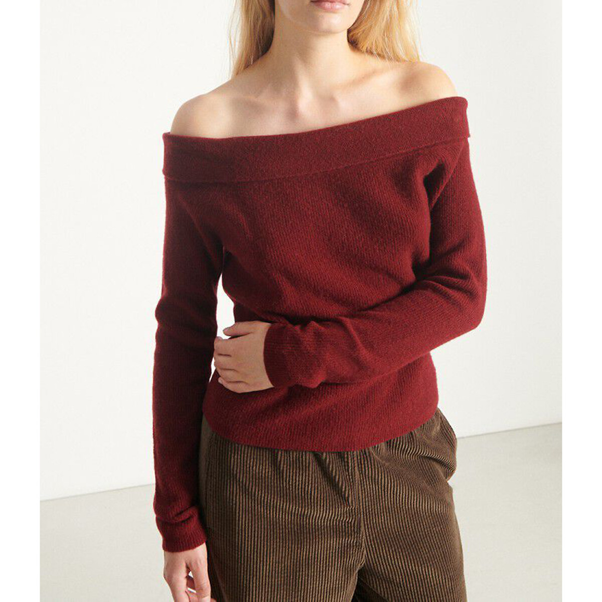 El jersey de manga larga para mujer de AMERICAN VINTAGE modelo RAXOW muestra los hombros con su escote tipo bandeau. Confeccionado principalmente con una mezcla de lana, este jersey ajustado presenta un tejido de punto finamente acanalado, suave y cálido gracias al toque de cachemira.Detalles del producto • Manga larga • Cuello drapeado • Canalé fino • Sisas raglánComposición y cuidados • 71% lana, 24% poliamida, 5% cachemira • Para su cuidado, te recomendamos seguir los consejos indicados en la etiqueta Marca: AMERICAN VINTAGE. Material: Lana. Talla M. Color Marron