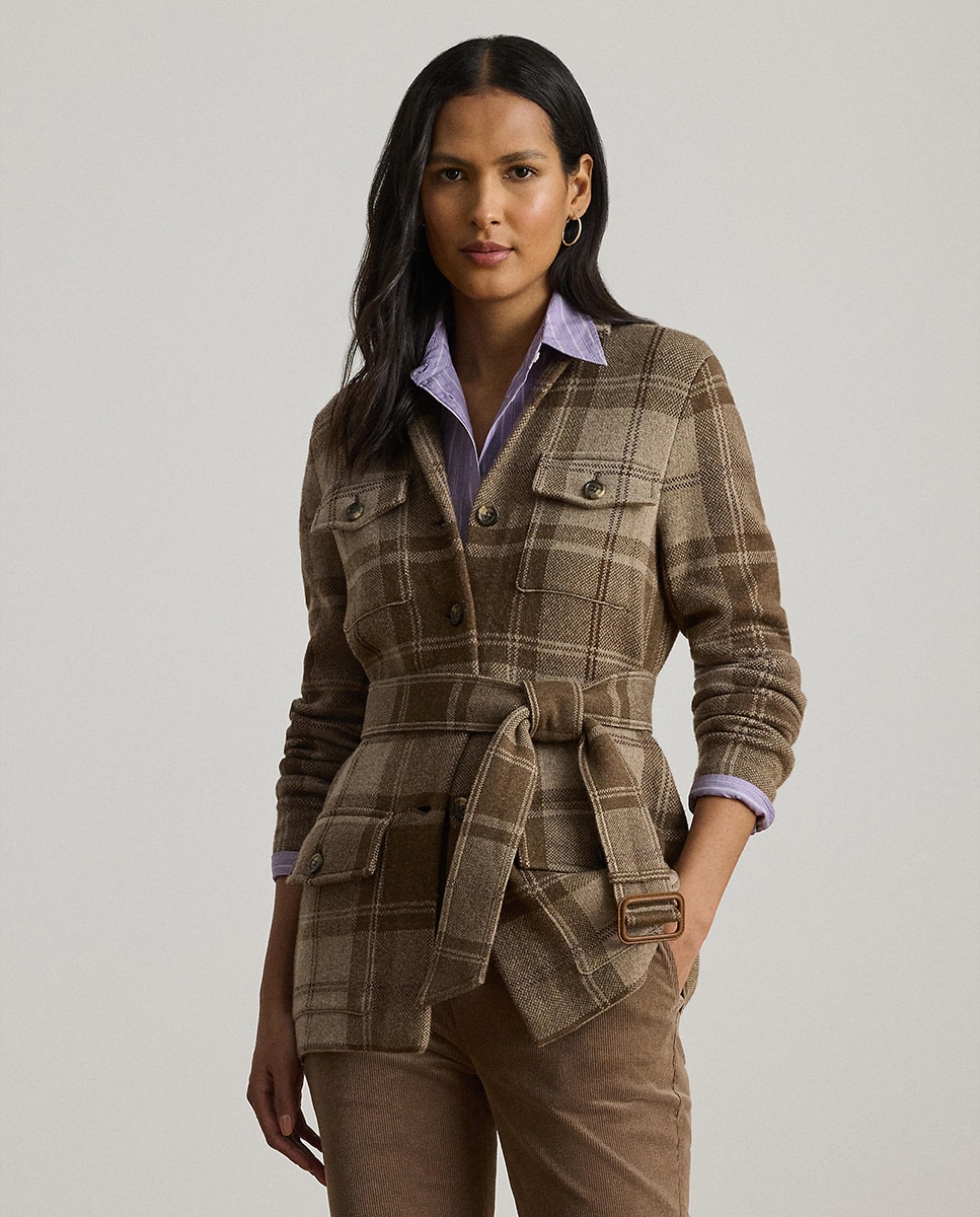 Lauren Ralph Lauren actualiza el blazer clásico con detalles de inspiración militar, como los bolsillos de parche con solapa con botones y el cinturón. Esta prenda incluye una lujosa mezcla de lana, algodón y cachemira en una estructura de punto doble de cuadros y se ha adornado con botones marca de la casa con efecto cuerno.