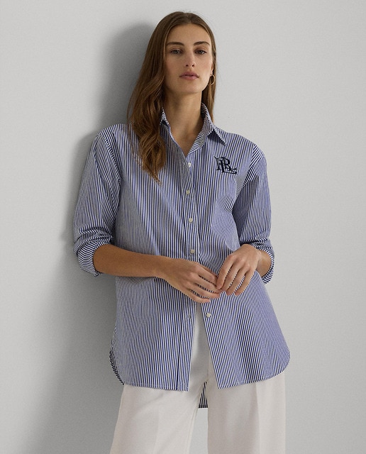 Esta camisa con un toque de elástico es un básico de fondo de armario que cuenta con la tecnología para algodón PUREPRESS™, un proceso de planchado duradero que evita las arrugas, reduce la pérdida de resistencia del material y protege contra la abrasión. Esta prenda, diseñada con un motivo de rayas verticales teñido en hilo, se completa con un logotipo LRL bordado en el pecho para aportar un estilo marca de la casa Lauren Ralph Lauren.