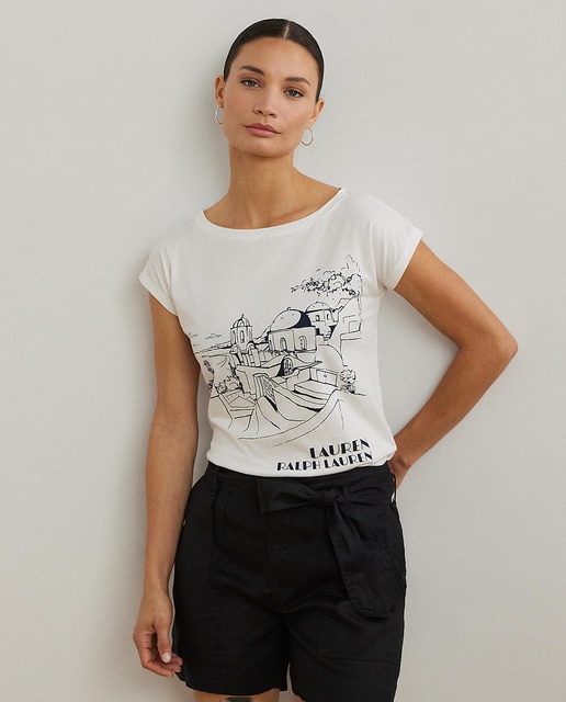 Esta camiseta con cuello barco y manga corta se ha confeccionado en punto jersey de algodón y presenta una bonita escena artística con el logotipo de la marca en la parte inferior izquierda.