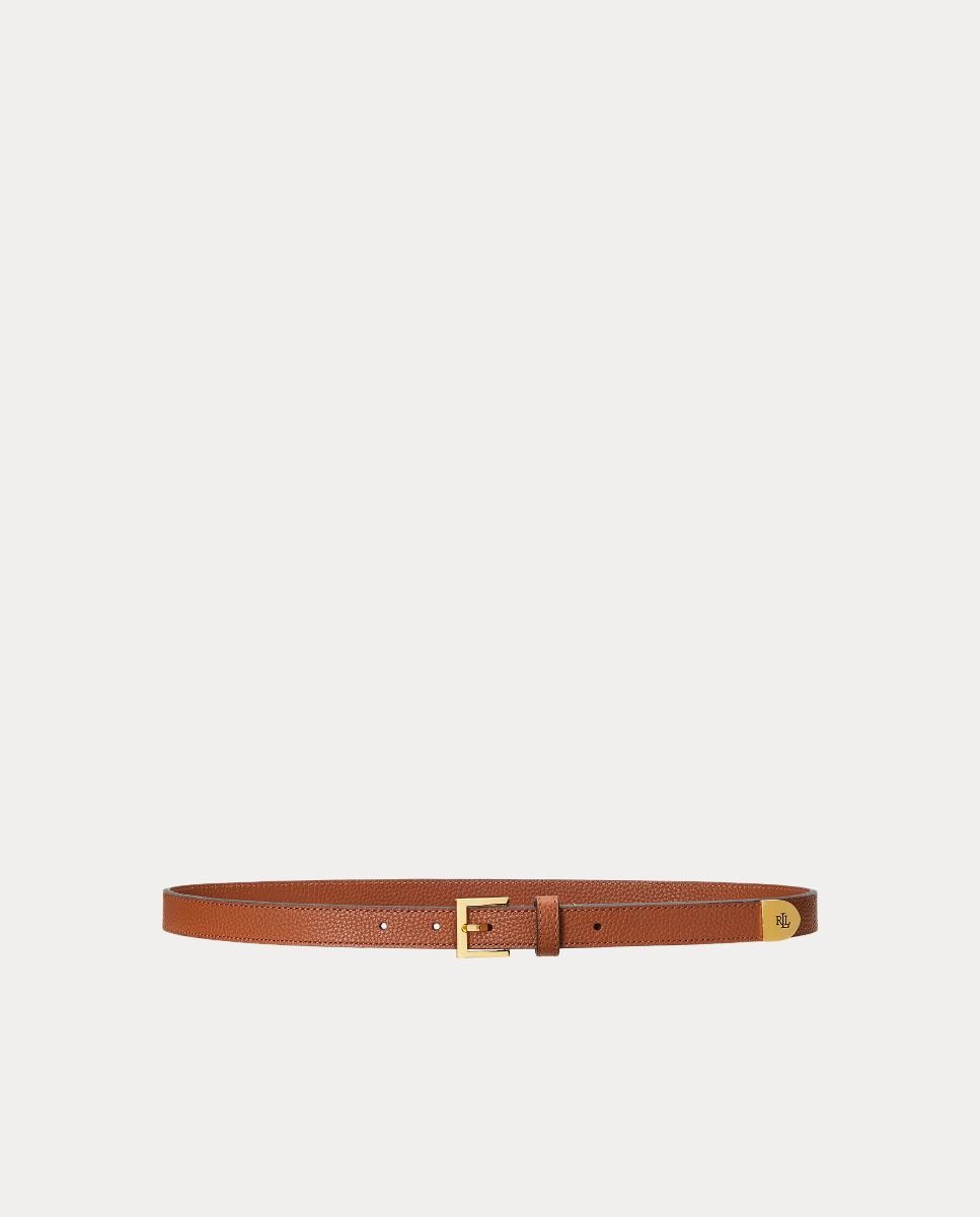 La lujosa piel granulada aporta una textura sutil a este elegante cinturón estrecho, diseñado con un extremo con acabado de latón grabado con las iniciales ‘LRL’ que aporta el toque marca de la casa.