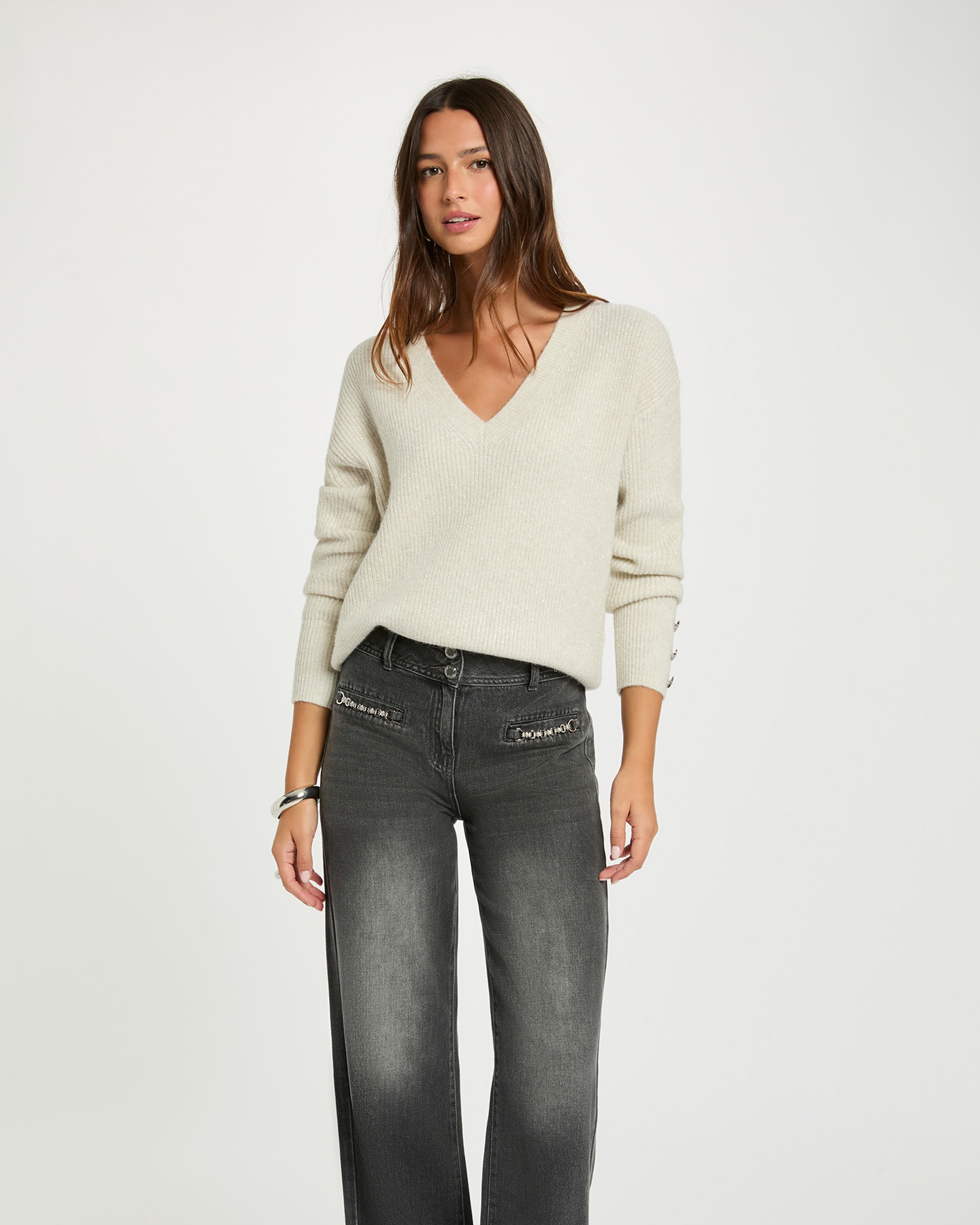 Jersey cuello en V oversize. Corte oversize. Cuello en larga. Punto medio. Detalles con hilos metalizados. Pico