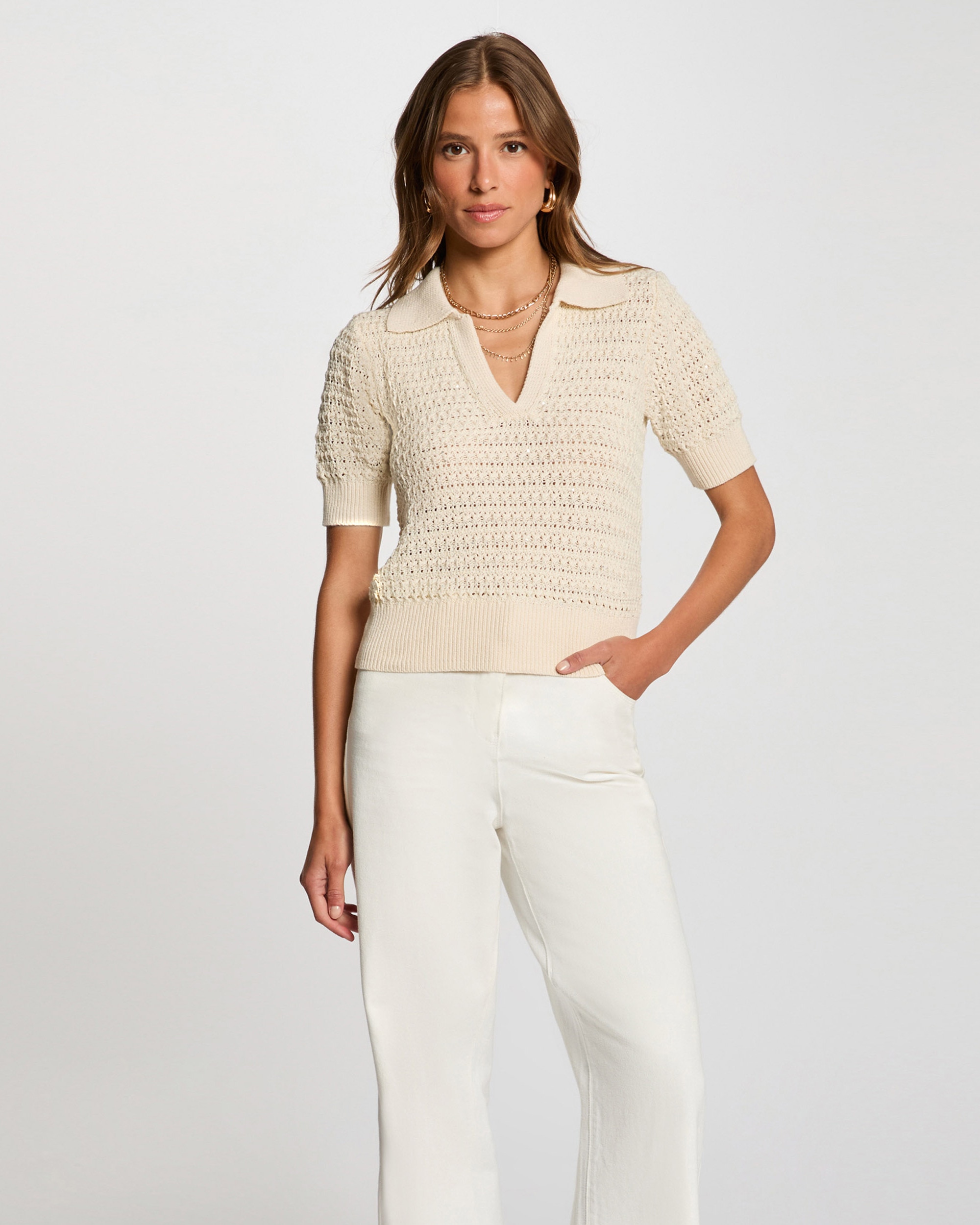 Jersey cuello tipo polo. Corte ajustado. Cuello tipo polo. Manga corta. Punto medio. Punto calado
