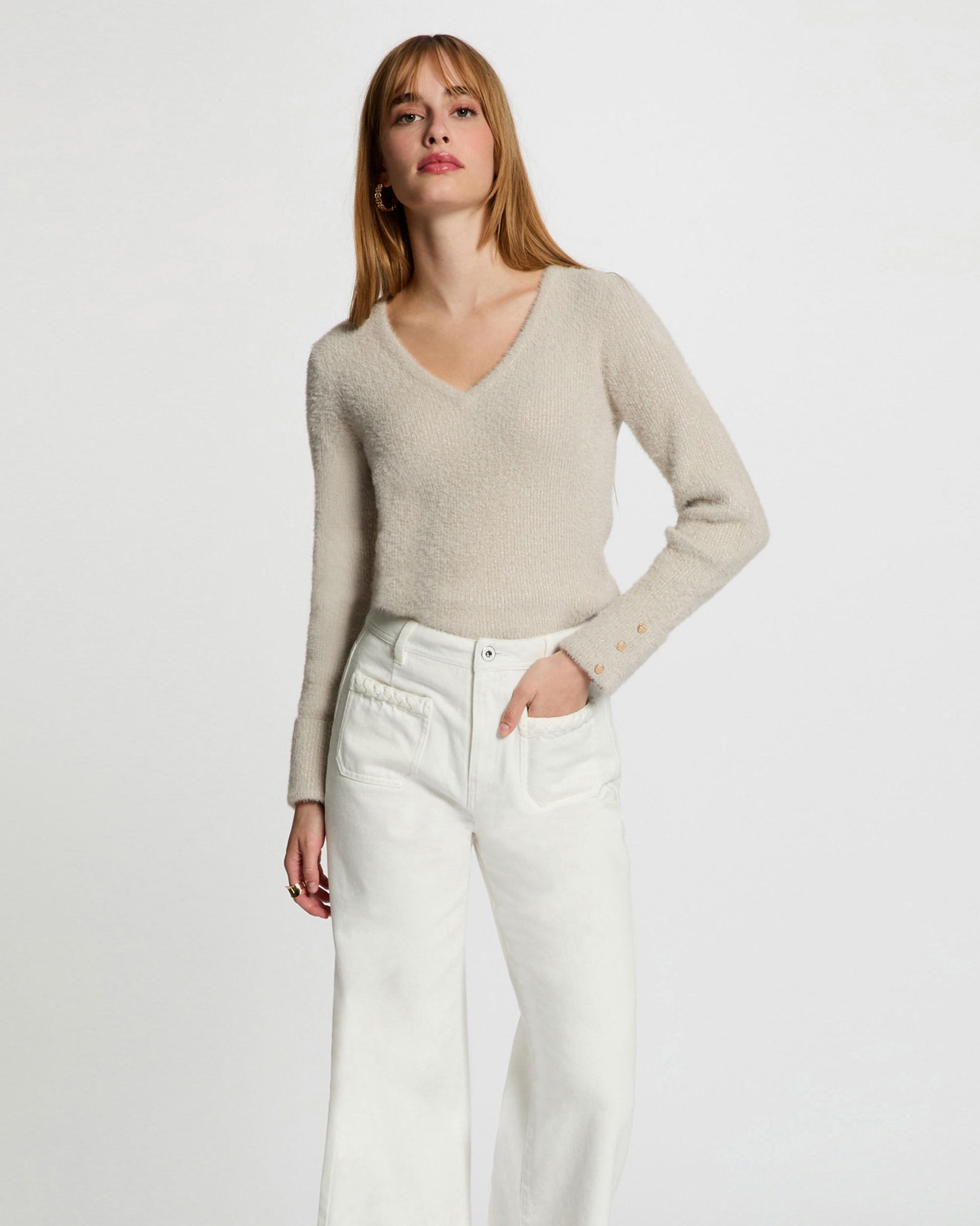Jersey manga larga con escote en V. Corte recto. Escote en V. Manga larga. Punto medio. Punto aterciopelado. Botones decorativos en los puños. Detalles con hilos metalizados. La modelo mide 1,75 m y lleva una talla S/36 Consejo de talla: elige tu talla habitual. Pico