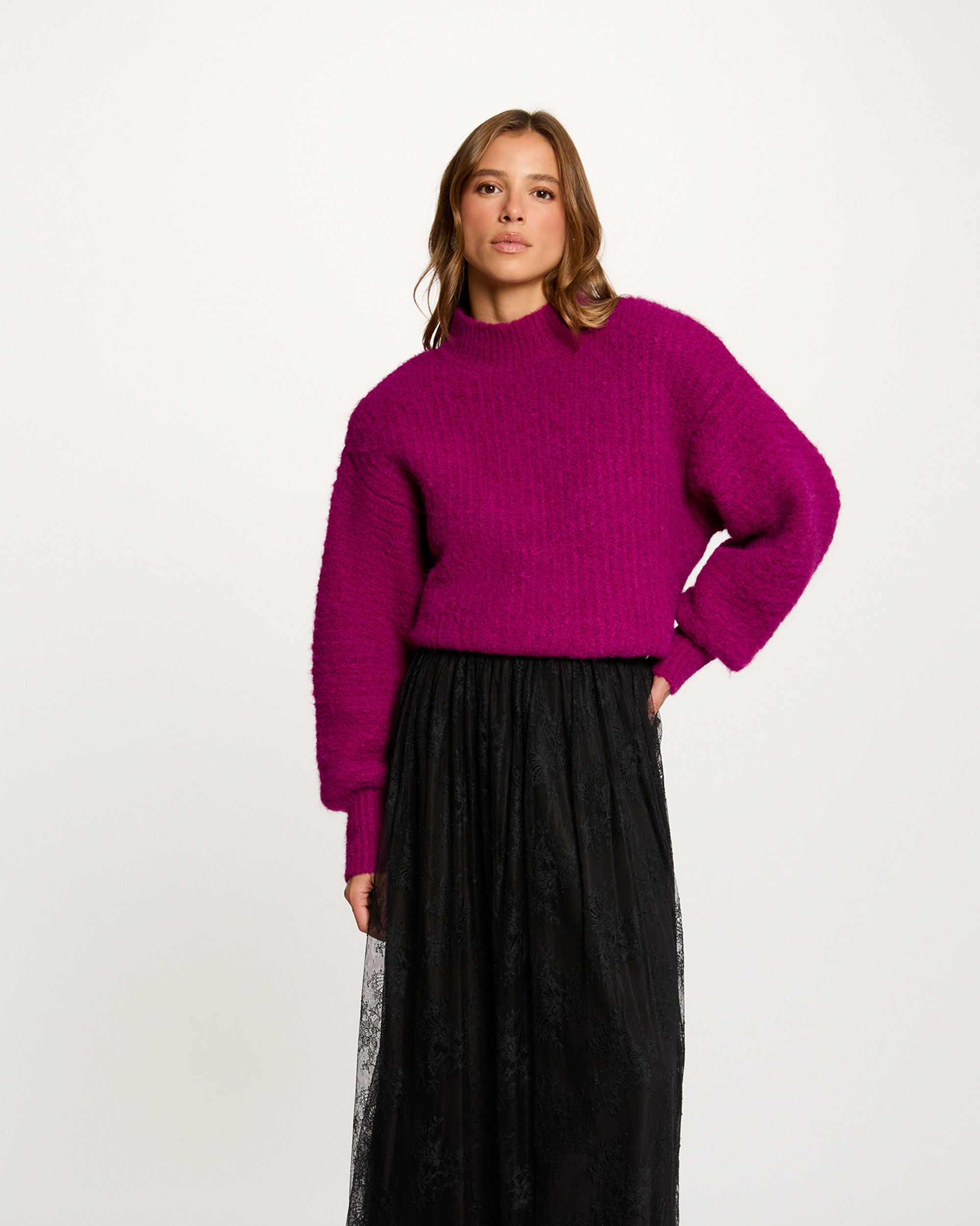 Este jersey oversize de largo medio encarna una elegancia moderna y desenfadada. Su cuello alto realza la postura del cuello mientras alarga la silueta con sutileza. El corte oversize se adapta armoniosamente a todas las morfologías, mientras que su longitud media aporta un toque femenino irresistible. – Jersey oversize – Cuello alto – Mangas largas. Alto