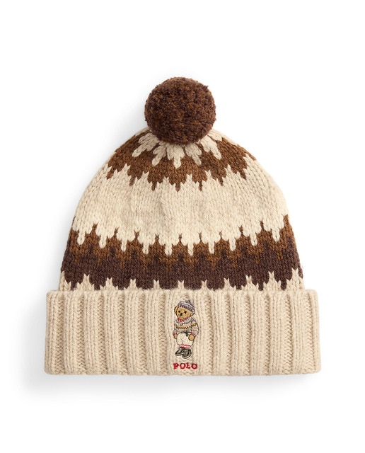 Este gorro, que combina una confección en punto de lana con una greca de rayas y un divertido pompón, muestra a nuestro adorable Polo Bear con un atuendo icónico de Ralph Lauren.