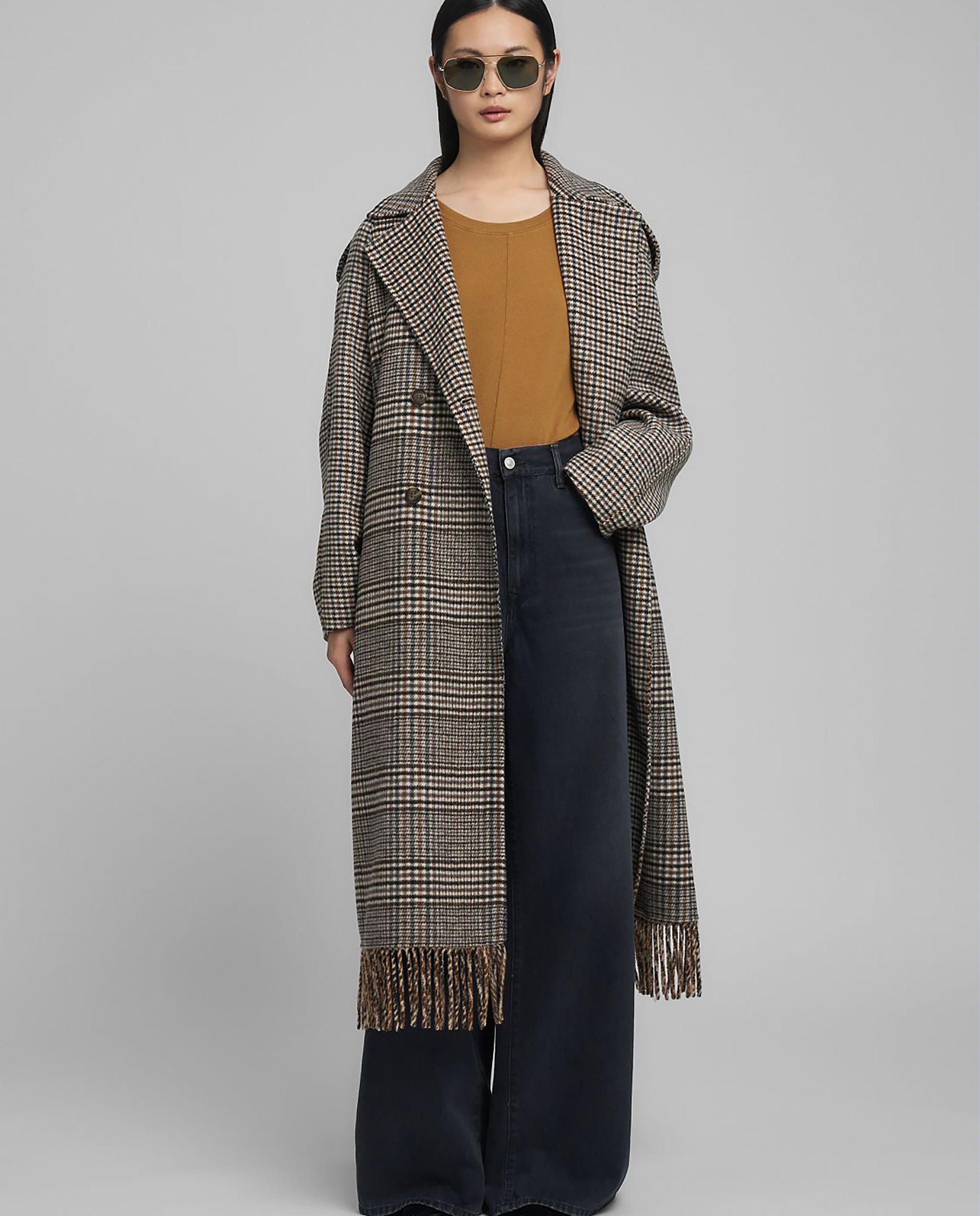 Abrigo largo de corte relajado confeccionado en mezcla de lana teñida en hilo con fantasía a cuadros y forro interior. Con un clásico cierre cruzado con botones, el modelo presenta un amplio cuello de solapas, dos prácticos bolsillos laterales, reguladores en los hombros y un cinturón para anudar en la cintura. La parte posterior de la prenda está acabada con un canesú que se inspira en las gabardinas y el logotipo rombo. El abrigo se caracteriza, en la parte inferior, por flecos que dan movimiento a la prenda. 100 % Viscosa